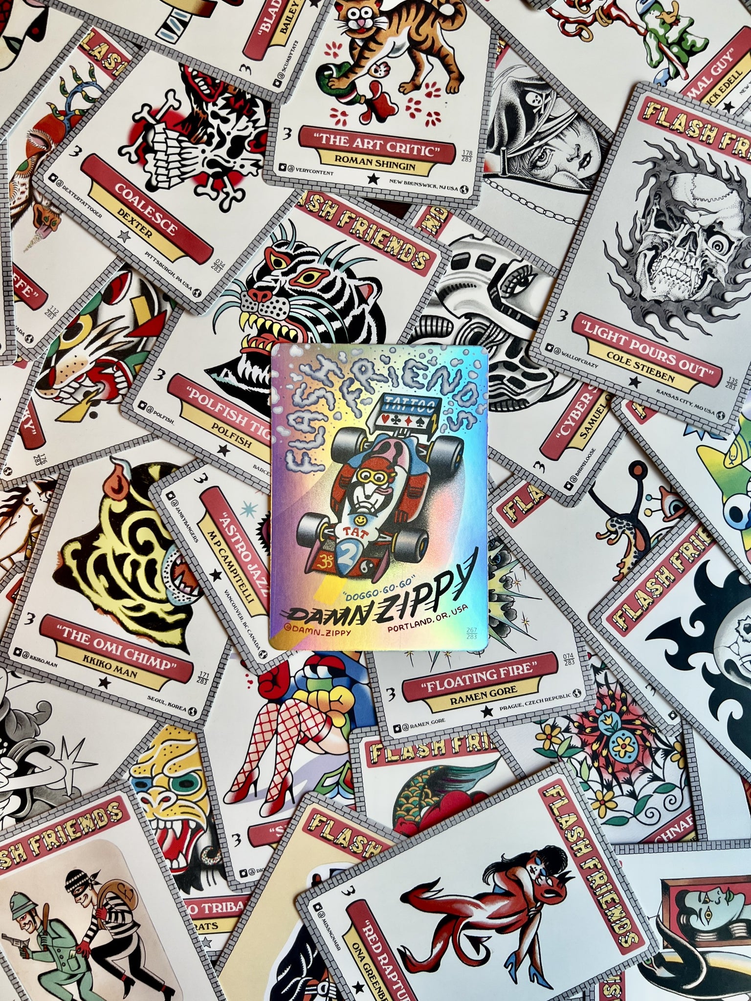 Collectible tattoo flash trading cards featuring art by tattoo artists from around the globe!